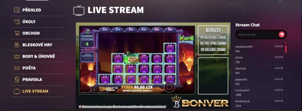 Na BonverCasino.cz jsme si uvědomili důležitost streamování pro naši komunitu, a proto jsme vyvinuli vlastní řešení, abychom o tyto zážitky nepřišli. Pokračujeme ve streamování online casinových her přímo přes náš věrnostní systém Bonver Aura. Tento inovativní program nejen odměňuje vaše hraní Krejcary, úkoly a exkluzivními bonusy, ale nyní také integruje streamy, kde můžete sledovat živé hraní vybraných her od našich streamerů.