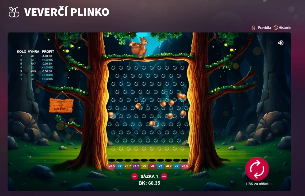 Pokud dáváte přednost vizuální podívané před zběsilou rychlostí, je tu pro vás Plinko. Cílem Bleskové hry Plinko je získat výhry shozením oříšků z vrcholu hracího pole, kterou tvoří okraje (stromy) a předem daný počet bublin (koliků). Sledujte tu fascinující cestu, jak se oříšky náhodně odráží a na konci trajektorie dopadnou do jednoho ze slotů umístěných na spodní straně hracího pole a určí tím výslednou výhru. Je to skvělý způsob, jak proměnit své body v další odměny.