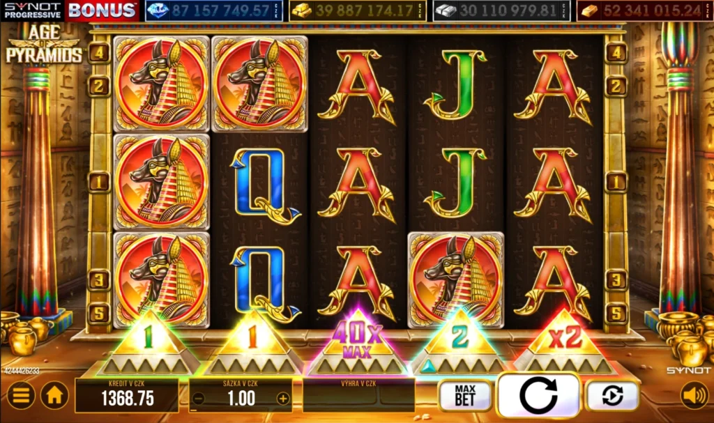 To, co dělá Age of Pyramids tak výjimečnou, je lišta průběhu nad válci. Zde postupně sbíráte speciální Scatter symboly různých barev – a jakmile nasbíráte 5 stejných na konkrétním válci, spustíte jednu z pěti exkluzivních bonusových funkcí! Každý válec má svůj typ Scatteru: