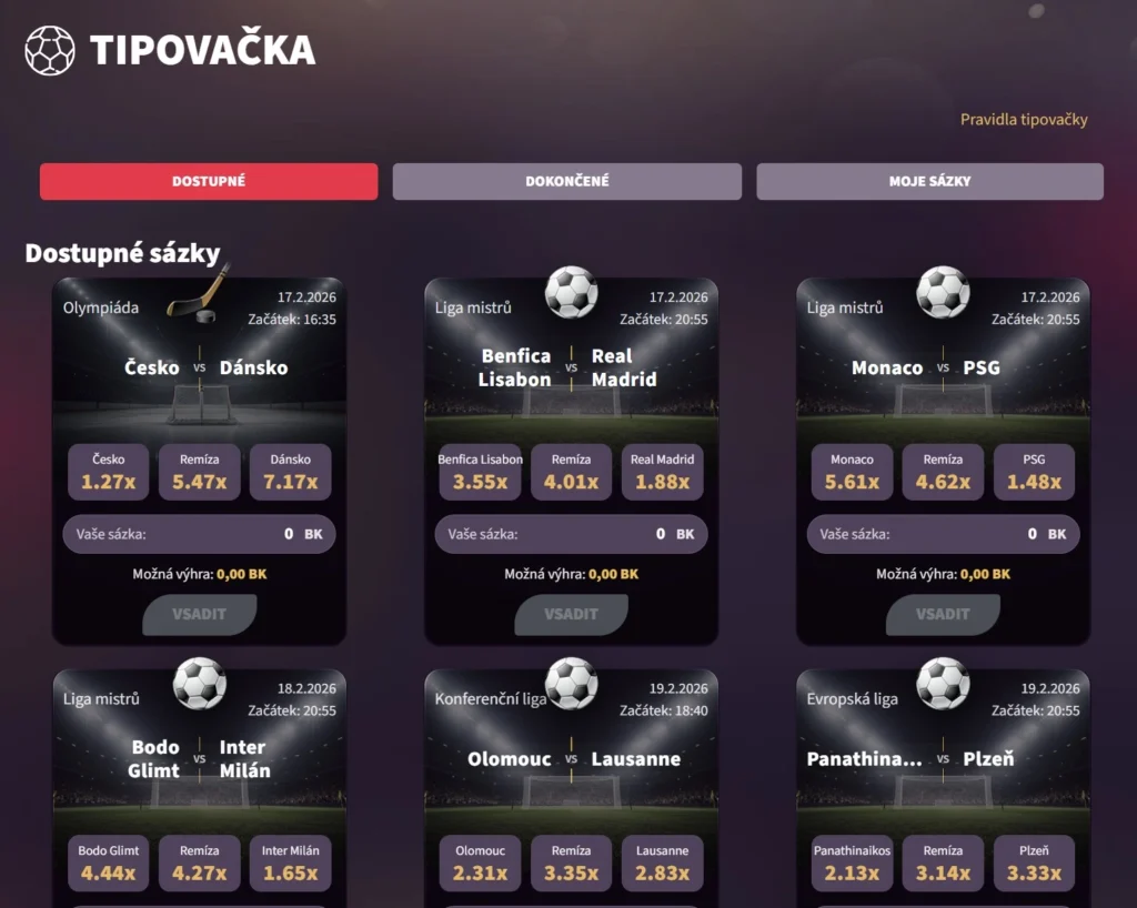 TIPOVAČKA je jednoduchý způsob, jak si zpříjemnit sledování oblíbených sportů. Vsadíte libovolný počet svých Bonver Krejcarů na výsledek vybrané události – například na vítěze zápasu, remízu nebo jiný nabízený výsledek. Žádné reálné peníze, žádné riziko pro Váš rozpočet – vše probíhá výhradně v rámci Bonver Krejcarů, které jste si nasbírali hraním v automatech nebo plněním úkolů na Bonver Casinu.